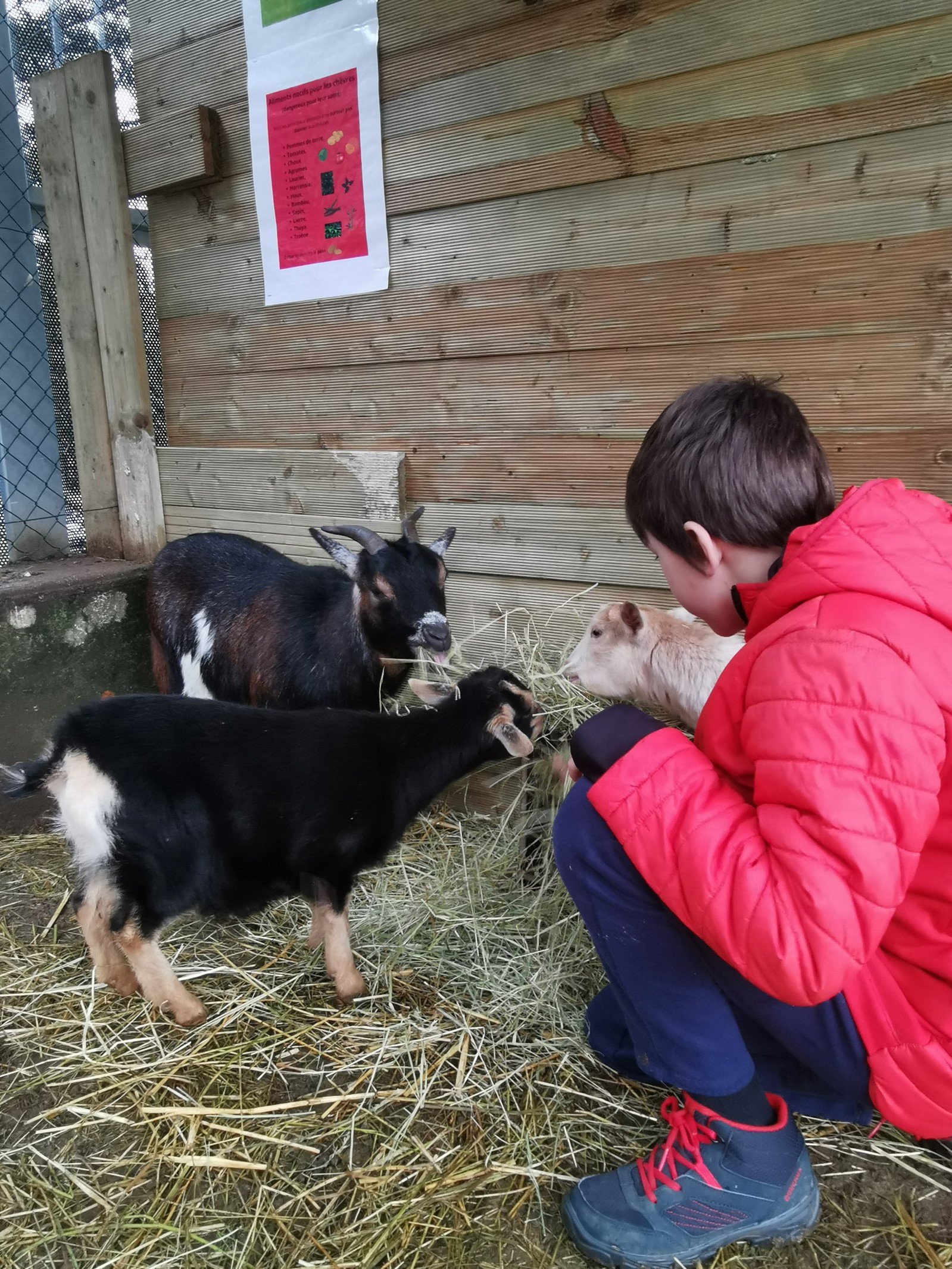 Lors des séances, les enfants sont invités à s'occuper des animaux et par là même, entrer en relation avec eux. Nous avons dans notre mini ferme, trois chèvres et cinq poules. Il s'agit pour l'enfant d'être attentif à l'animal et adapter son comportement, son attitude et sa communication au réactions de l'animal.